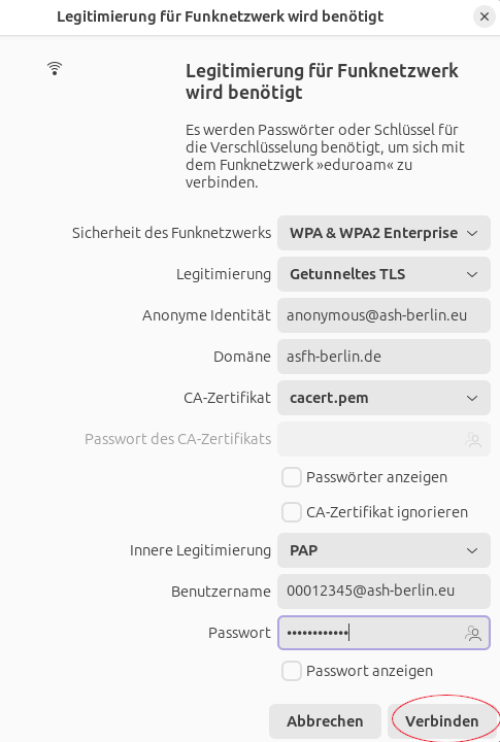 Für die Einrichtung von eduroam unter Linux benötigen Sie ein CA-Zertifikat. Das Zertifikat können Sie hier downloaden: