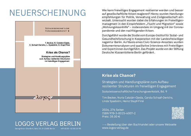 - Becker T, Catalán N, Schaaf-Derichs C, Spadolini L, Stapf-Finé H (2025) Krise als Chance? Strategien und Handlungspläne zur Stärkung des freiwilligen Engagements in Krisenzeiten. In: Walter, Andrea/Haas, Benjamin/Kewes, Andreas/Mangold, Katharina/Schlicht, Julia (Hg.): Umbruch, Druck, Transformation? Gegenwart und Zukunft des Engagements, Baden-Baden: Nomos, S. 299-312