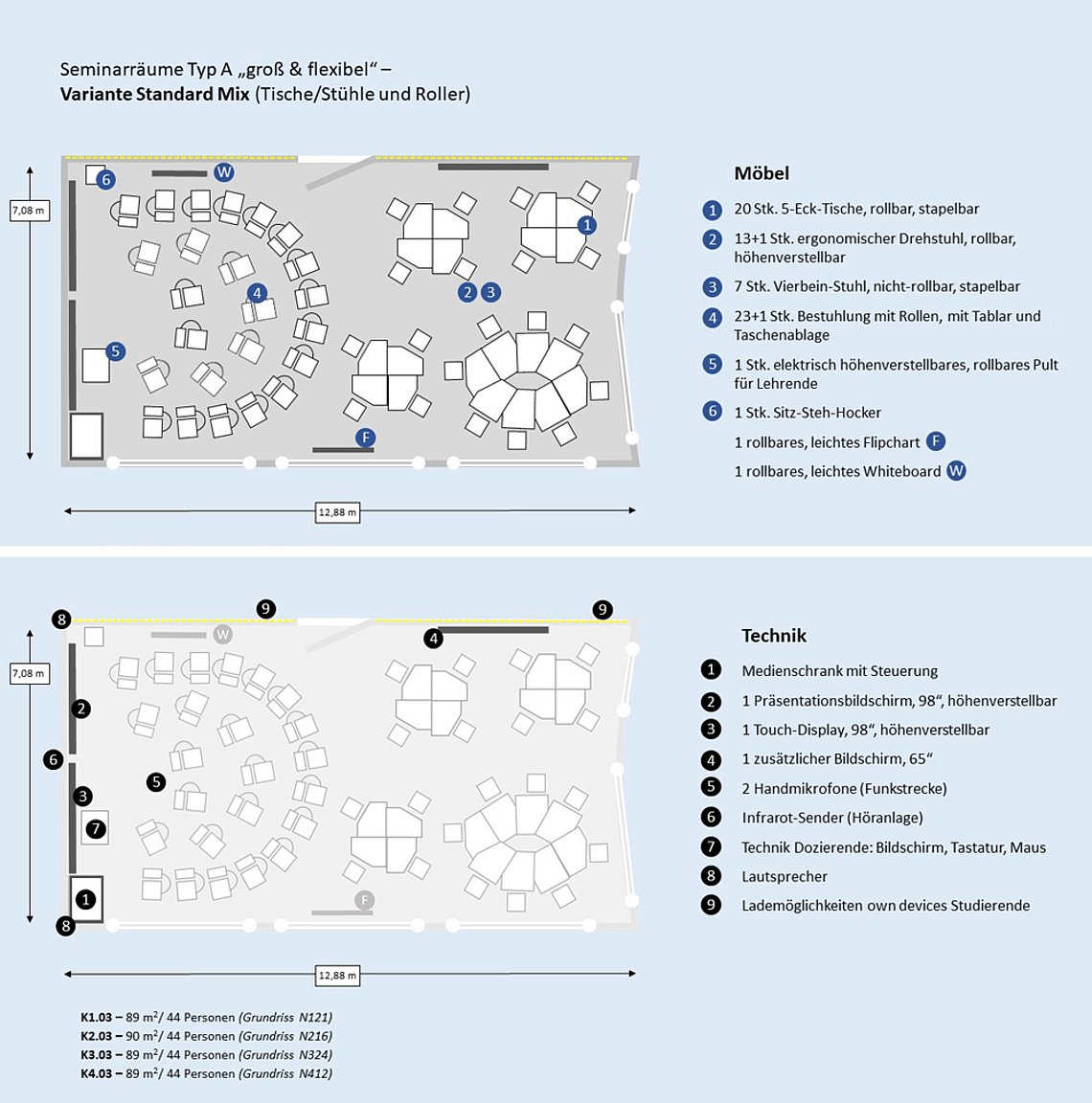 In der 2. und 4. Etage befinden sich die Räume K2.24 und K4.16, die fast ausschließlich mit rollbaren, höhenverstellbaren Drehstühlen mit Tablar möbliert sein sollen. Im Sinne der Inklusion sind jedoch auch einige Stühle ohne Tablar, die mit kleinen rollbaren Einzeltischen ergänzt werden können, geplant.