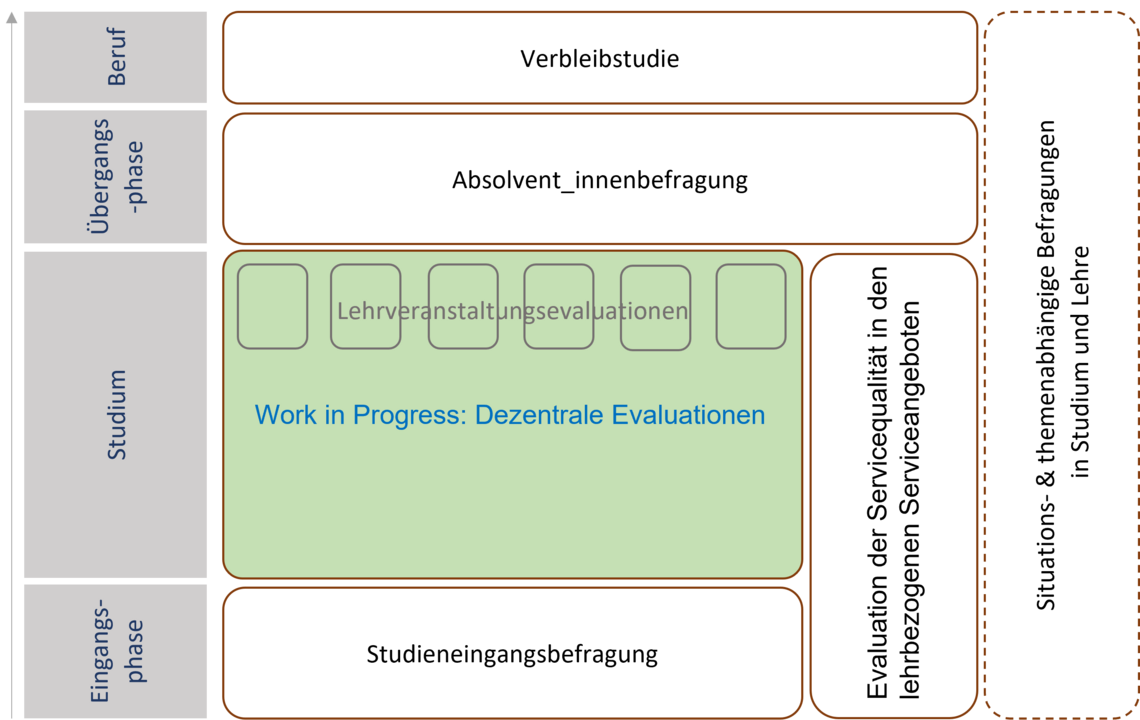Gemeinsam mit den Studiengängen werden auf dezentraler Ebene weitere Erhebungen entwickelt. Diese können beispielsweise semesterbezogene Evaluationen beinhalten und damit die Lehrveranstaltungsevaluation ergänzen, und fachbereichs- und studiengangsspezifische Erhebungen einschließen, um noch fehlende Daten für die Bewertung und Weiterentwicklung der Studiengänge zu erfassen.