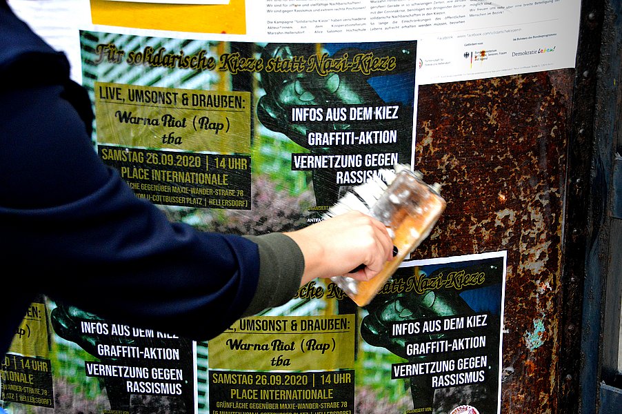 Nazi-Propaganda und rechte Übergriffe sind weiterhin ein Thema im Bezirk Marzahn-Hellersdorf - auch im Umfeld des Cottbusser Platzes. Zudem finden immer wieder rassistische und sexistische Angriffe im öffentlichen Raum statt. Darauf weisen das Register zur Erfassung rechtsextremer und diskriminierender Vorfälle Marzahn-Hellersdorf sowie die Antirassistische Registerstelle an der ASH Berlin regelmäßig hin.