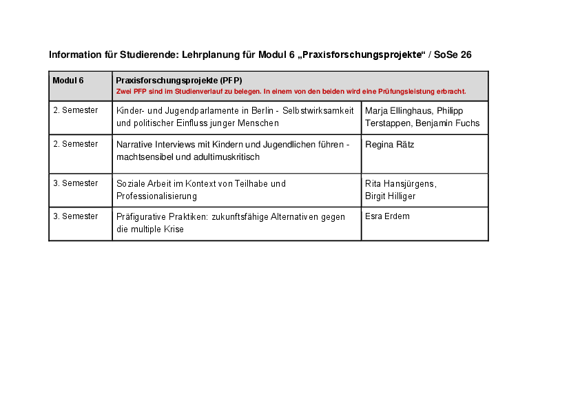 Die Praxisforschungsprojekte (PFP) sind Forschungswerkstätten, in denen Theorie- und Methodenkenntnisse vertieft und empirische Forschungsvorhaben in Praxisfeldern Sozialer Arbeit und Pädagogik (der Kindheit) umgesetzt werden. Sie variieren in jedem Semester: