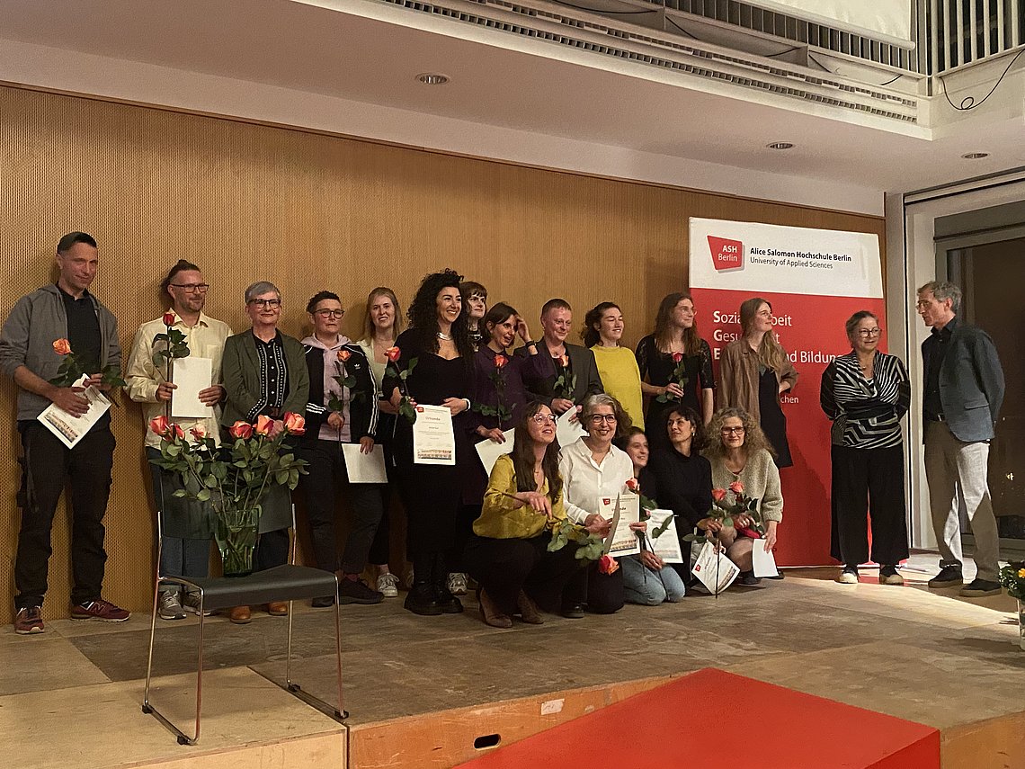 Am 06.10.23 fand die jährliche Abschlussfeier des Masterstudiengangs „Praxisforschung in Sozialer Arbeit und Pädagogik“ statt. Die Studiengangsleitung und -koordination verabschiedete 16 Absolvent*innen aus dem Wintersemester 2022/23 sowie dem Sommersemester 2023. Neben Getränken und einem ansprechend angerichtetem Buffet gab es gute Gespräche und Verabschiedungen. Sowohl Prof. Dr. Esther Lehnert als auch die Prorektorin Prof. Dr. Anja Voss begleiteten den Abend mit einer Abschlussrede. Höhepunkt des Abends war die Rede der Absolventin Pelin Sor. Wir danken allen Absolvent*innen und Gästen für den gelungenen Abend und freuen uns darauf, die neuen Absolvent*innen zur nächsten Abschlussfeier am 11.10.24. begrüßen zu dürfen.